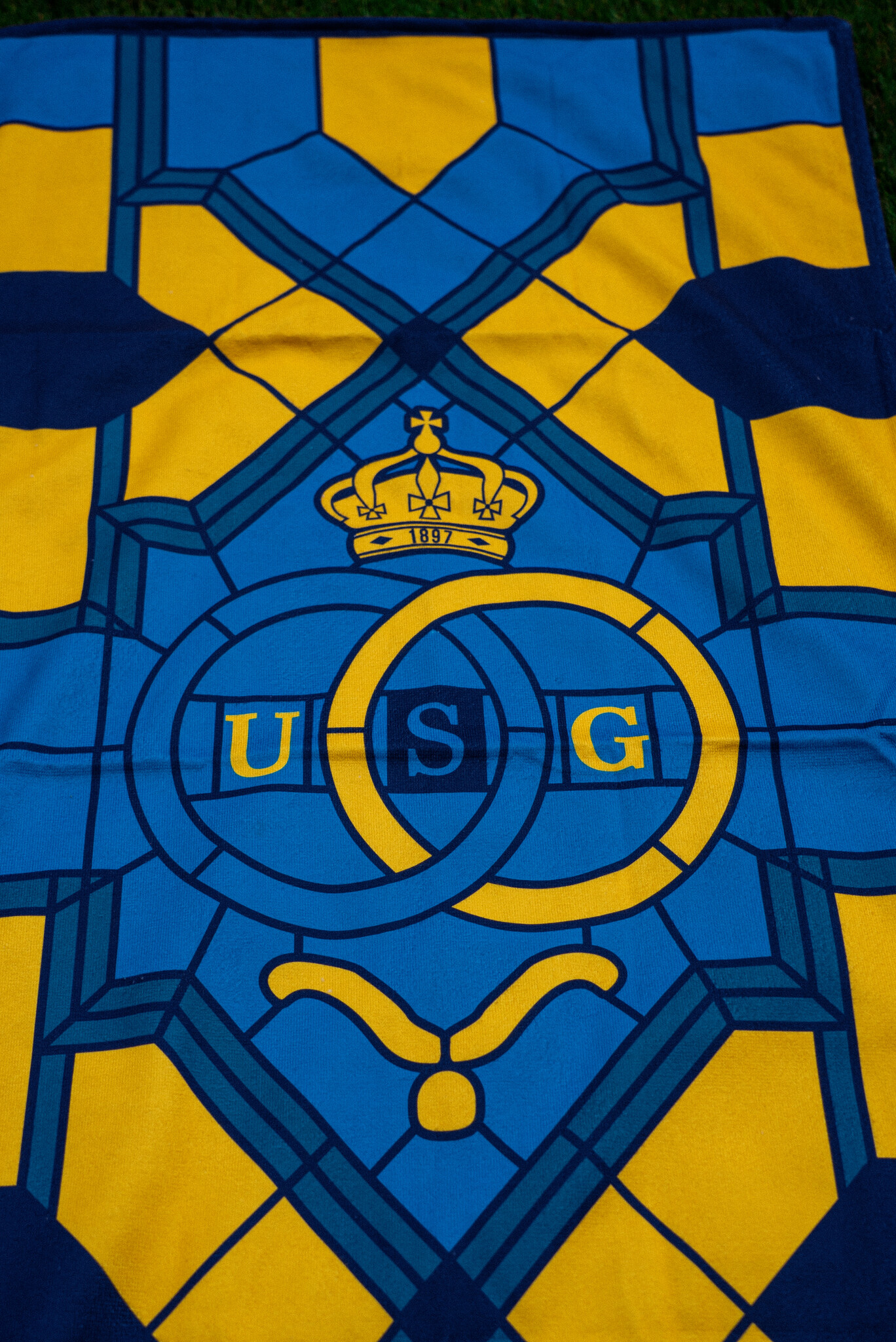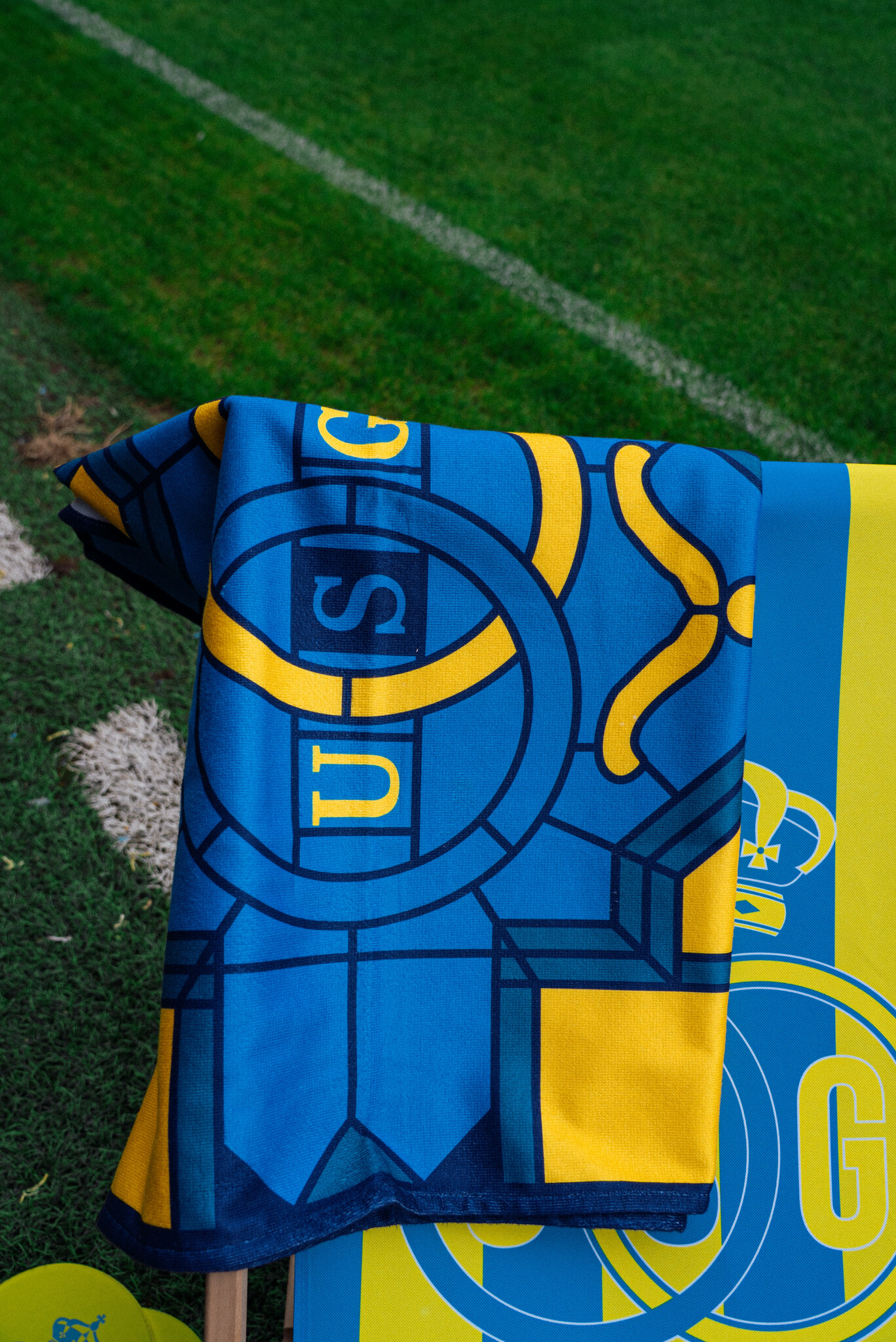Voici l'accesoire indispensable pour vos sorties à la plage : la serviette de plage Union, inspirée des vitraux du stade.